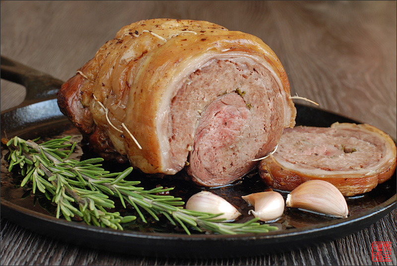 Выложить рулет в противень, немного посолить и поперчить, смазать при помощи кулинарной кисти маслом и отправить в духовку. Запекать 1,5 часа, периодически поливая мясо вытопившимся жиром. Перед тем, как разрезать рулет, ему следует дать «отдохнуть» минут 10, чтобы соки внутри мяса равномерно распределились. Перед подачей не забудьте удалить шпагат.
