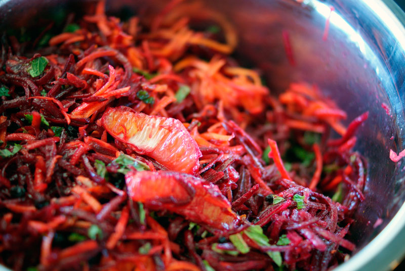 Натереть на терке овощи и яблоко. Заправить соком лимона, постным маслом. Соль и специи по вкусу. Можно добавить чеснок.