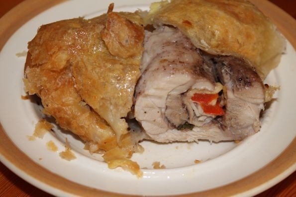 Дальше взял слоёное тесто, раскатал его в пласт, толщина пласта получилась миллиметра 3-4, тоньше не нужно, положил фаршированное бедро и закатал в тесто.